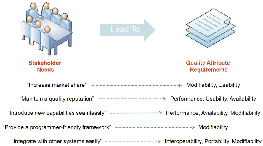 understandability, usability, modifiability, interoperability, reliability, portability, maintainability, scalability, sonfigurability, customizability, adaptability, cariability, volatility, traceability - ities