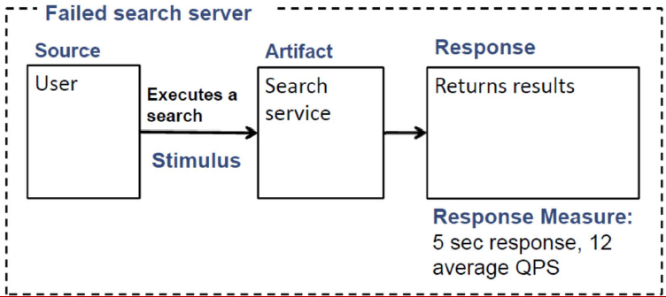 - Refined Scenario : in the event of hardware failure, search service is expected to return results within 5 sec, in 12 average QPS.